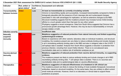 UK risk assessment for Omicron variant B.1.1.529, dated 3rd December 2021 Transmissibility between humans: Amber – At least as transmissible as currently circulating variants Omicron is transmitting rapidly and successfully. … Continue reading UKHSA risk assessment for Omicron variant